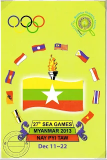 27th South East Asian Games was hosted by Myanmar and it took place in major cities like Naypyidaw, Yangon, Mandalay and Ngwesaung beach from December 11 to 22. Myanmar post commemorated the games by issuing the stamps, miniature sheet and commemorative postmarks of sport village. The sport village postmarks are documented in the previous blog post.